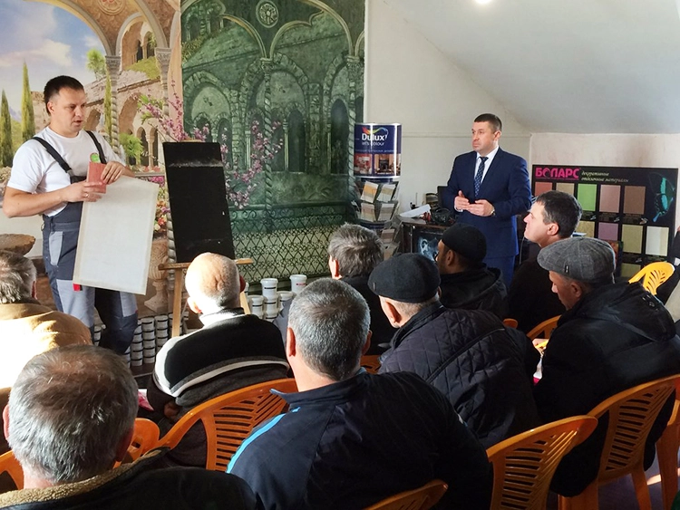 Сергей Сысоев продемонстрировал способы и варианты нанесения декоративных материалов ТМ БОЛАРС.