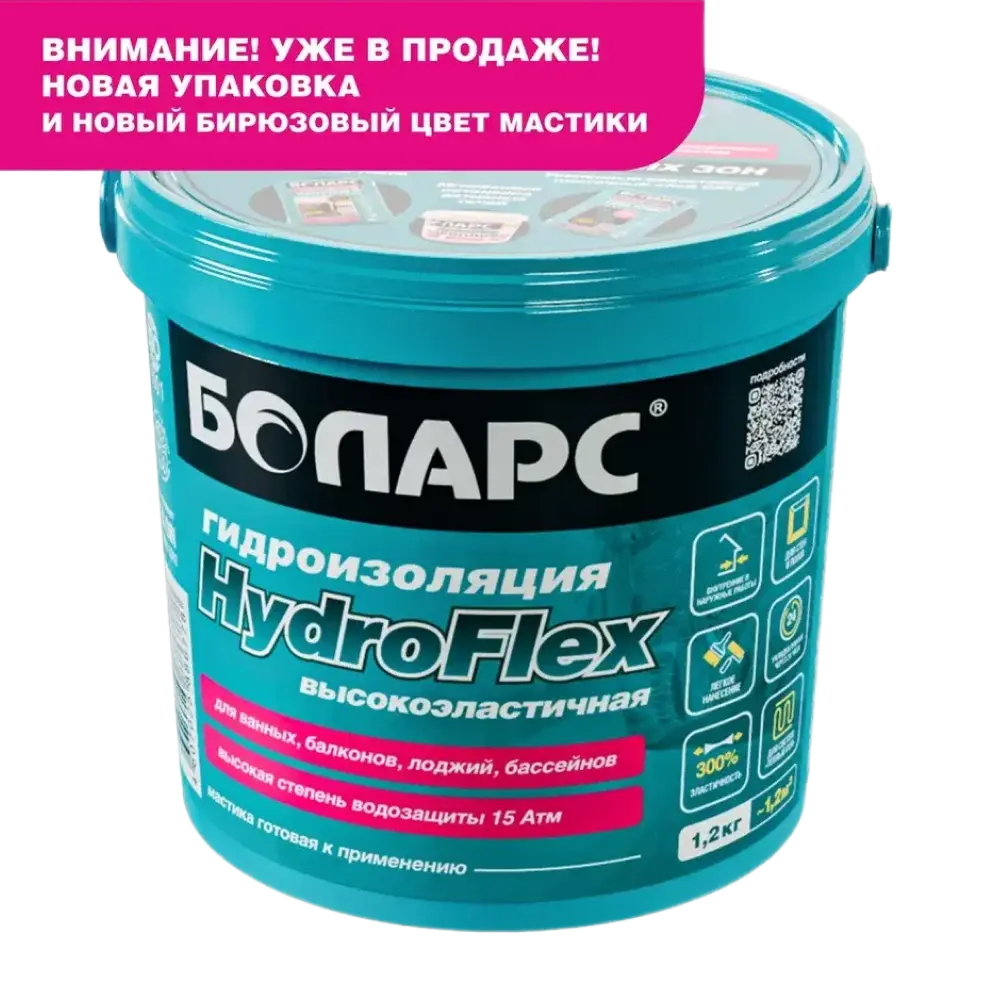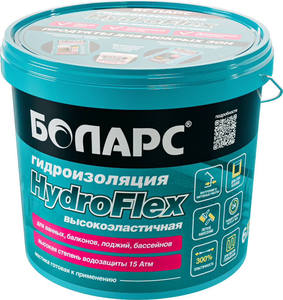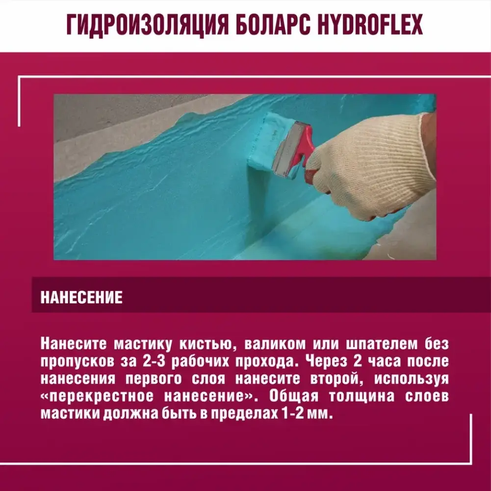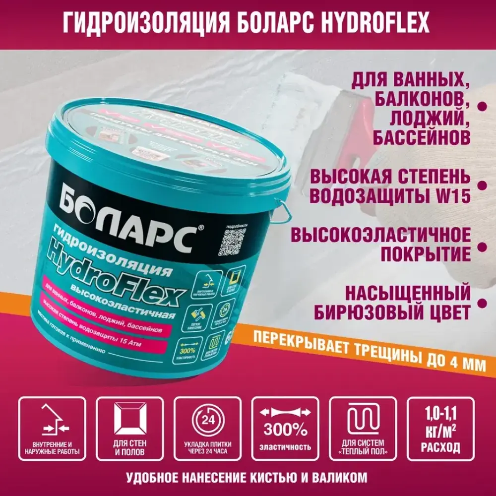 Гидроизоляционная мастика БОЛАРС «HydroFlex» предназначена для устройства бесшовной гидроизоляции стен, полов и рабочих поверхностей во влажных помещениях (кухни, ванные комнаты, душевые кабины, прачечные, балконы) перед облицовкой керамической плиткой. Для защиты оснований из бетона, кирпича, пенобетона, каменных и керамических кладок, цементно-песчаных штукатурок, в том числе для защиты чувствительных к влаге оснований: гипсовых штукатурок и полов, гипсокартонных и гипсоволокнистых листов, пазогребневых плит и блоков. Используется в системах «теплый пол».