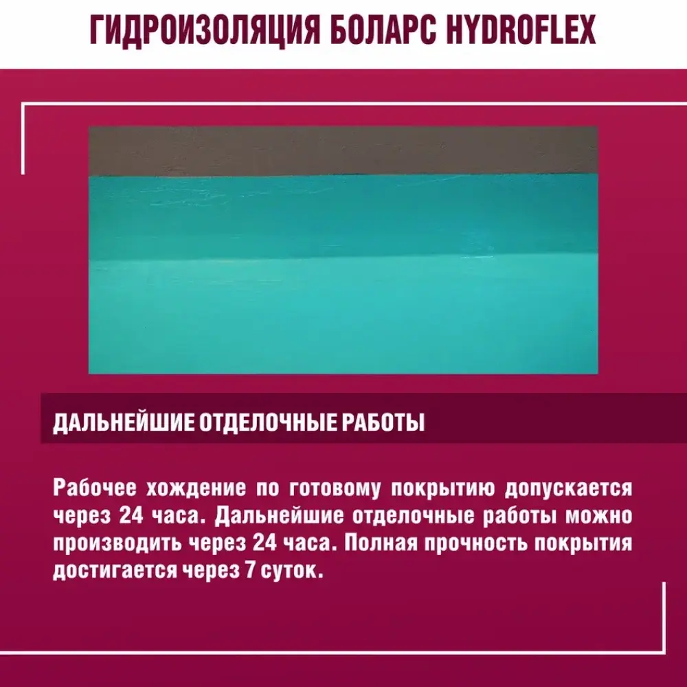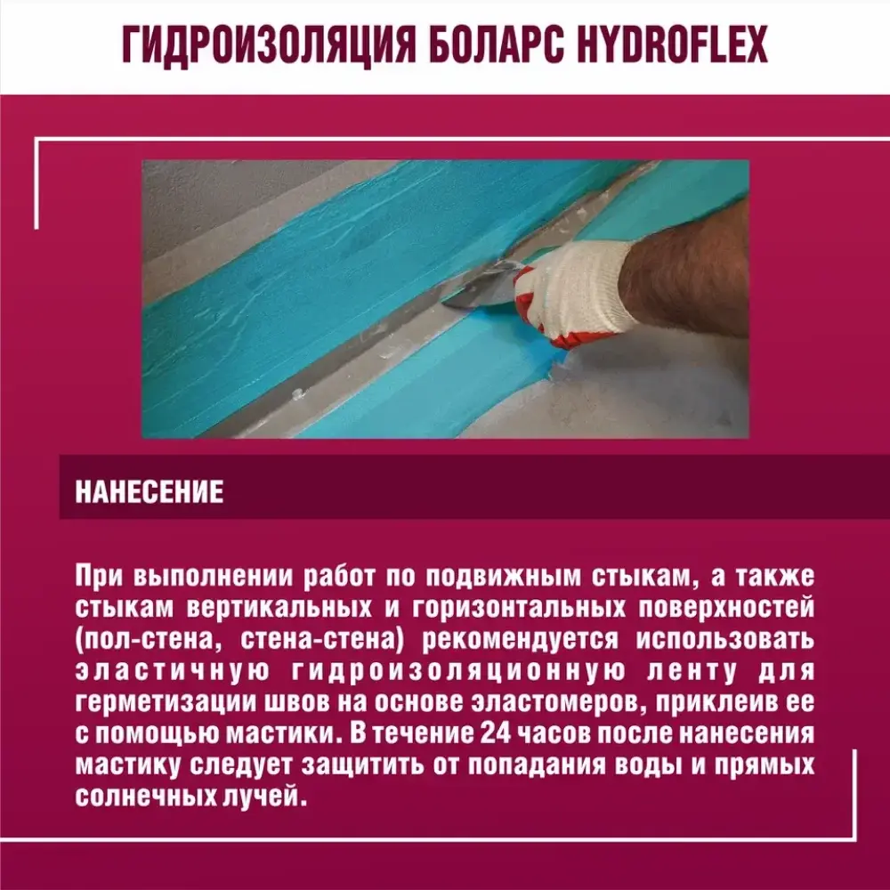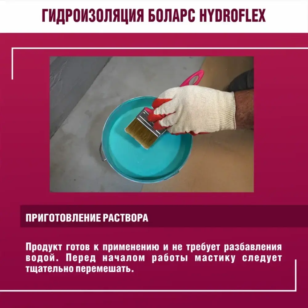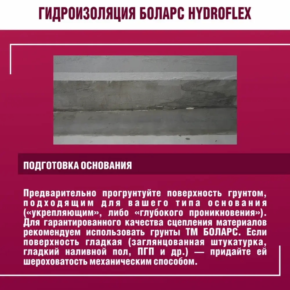 Гидроизоляционная мастика БОЛАРС «HydroFlex» предназначена для устройства бесшовной гидроизоляции стен, полов и рабочих поверхностей во влажных помещениях (кухни, ванные комнаты, душевые кабины, прачечные, балконы) перед облицовкой керамической плиткой. Для защиты оснований из бетона, кирпича, пенобетона, каменных и керамических кладок, цементно-песчаных штукатурок, в том числе для защиты чувствительных к влаге оснований: гипсовых штукатурок и полов, гипсокартонных и гипсоволокнистых листов, пазогребневых плит и блоков. Используется в системах «теплый пол».